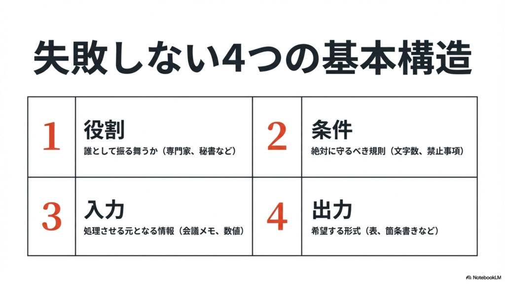 このように4つのブロックに分けて指示を書くことで、AIは「どこまでが命令で、どこからが処理対象のデータなのか」を正確に理解できるようになります。