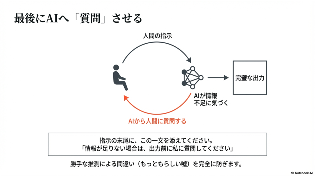この一文があることで、AIが勝手な推測で誤った回答を出すのを防ぎ、対話を通じて本当に必要な情報を引き出してくれる優秀なアシスタントへと変わります。