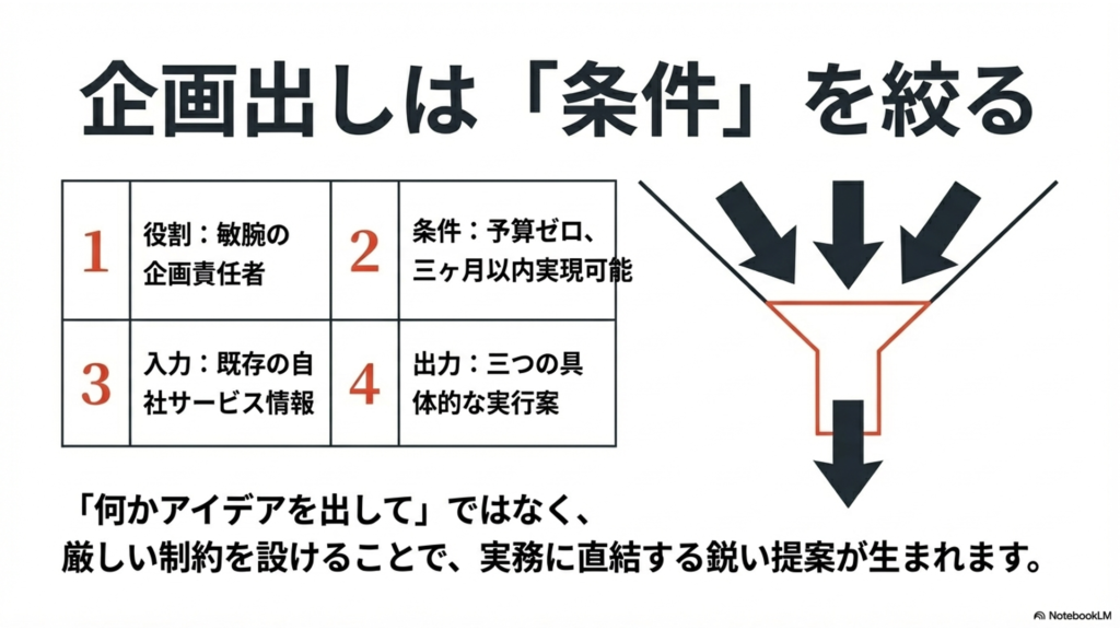 新しい企画やキャンペーンのアイデアを出す際、私の場合、単に「アイデアを出して」とお願いするのではなく、前提となる条件やターゲット層を細かく指定するように心がけています。