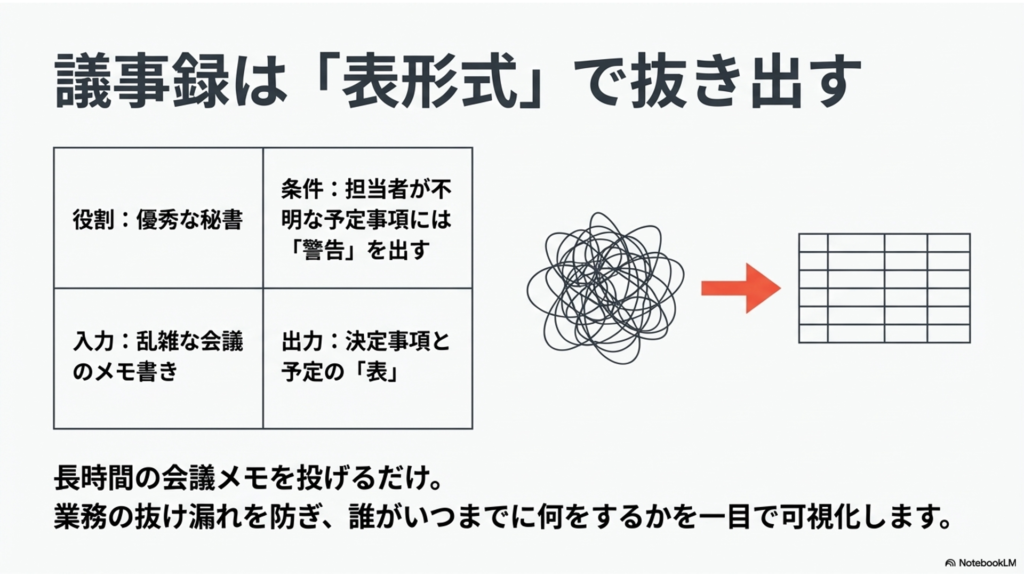 「以下の会議メモから、決定事項と次回までのToDoリストを表形式で抽出してください」と指示を出すだけで、誰がいつまでに何をするべきかが一目でわかるように整理されます。
