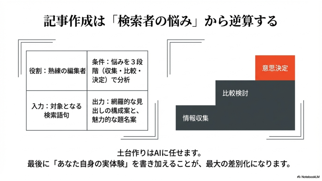 「このキーワードで検索するユーザーの悩みを、情報収集、比較検討、意思決定の3つのフェーズに分けて分析し、見出しの構成案を作って」と指示を出します。
