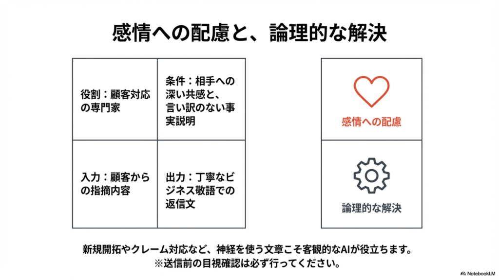「相手の感情に最大限共感し、不快な思いをさせたことを真摯に謝罪する」「言い訳がましくならないように事実と原因を伝える」「今後の具体的な対応策と再発防止策を提示する」といった条件を箇条書きで厳密に指定します。