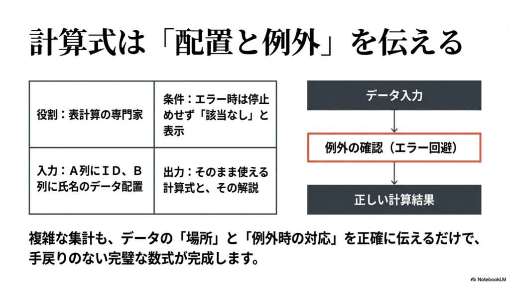 また、IFERROR関数などを用いてエラー処理も行ってください」と指示すれば、複雑なVLOOKUPやSUMIFS関数などを組み合わせた、そのままコピーして使える数式を手に入れることができます。