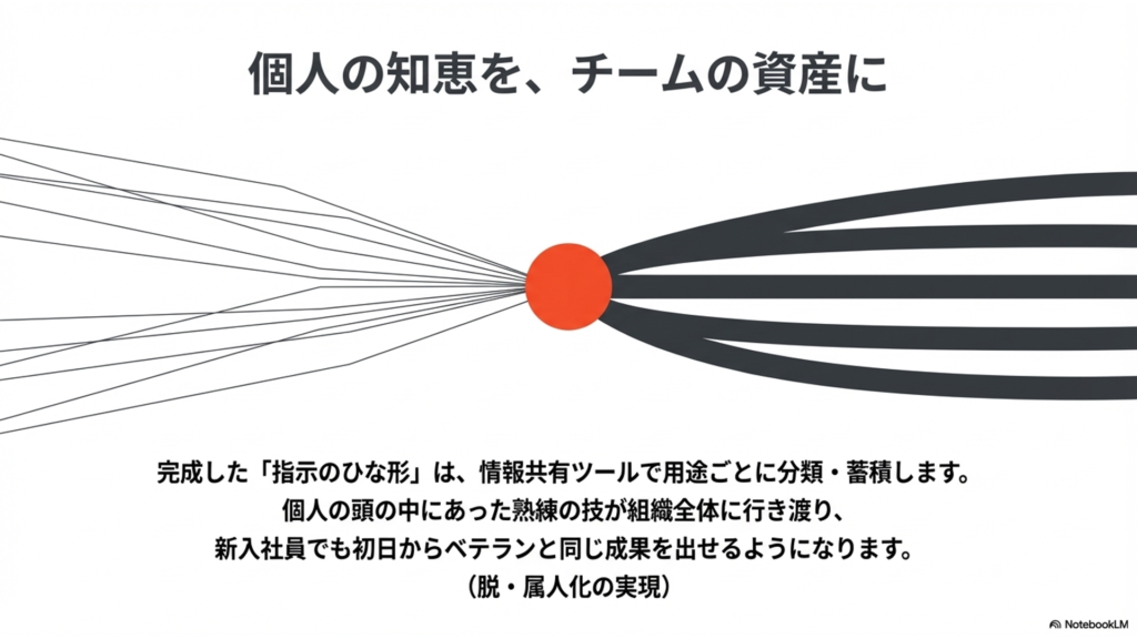 優秀なテンプレートを組織内で共有すれば、新入社員やAIに不慣れなメンバーでも、ベテランと同じレベルの質の高い出力を得ることができるようになります。