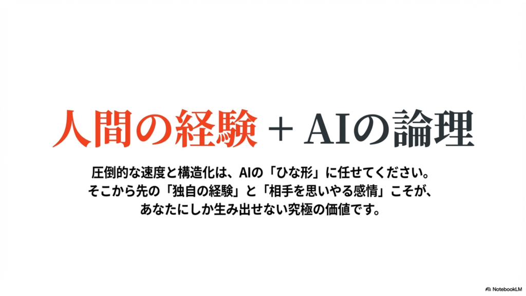 AIが構築した論理的な骨組みや、提案してくれた幅広いアイデアの土台の上に、最終的にはご自身の現場での経験、独自の視点、そして相手を思いやる感情という「人間ならではのひと手間」を加えることが不可欠です。